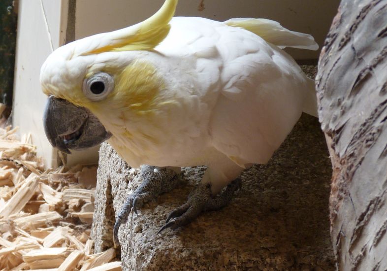 Ein Gelbwangenkakadu hockt auf einem Stein im Innenbereich seines Geheges im Zoo Neuwied und schaut neugierig in die Kamera