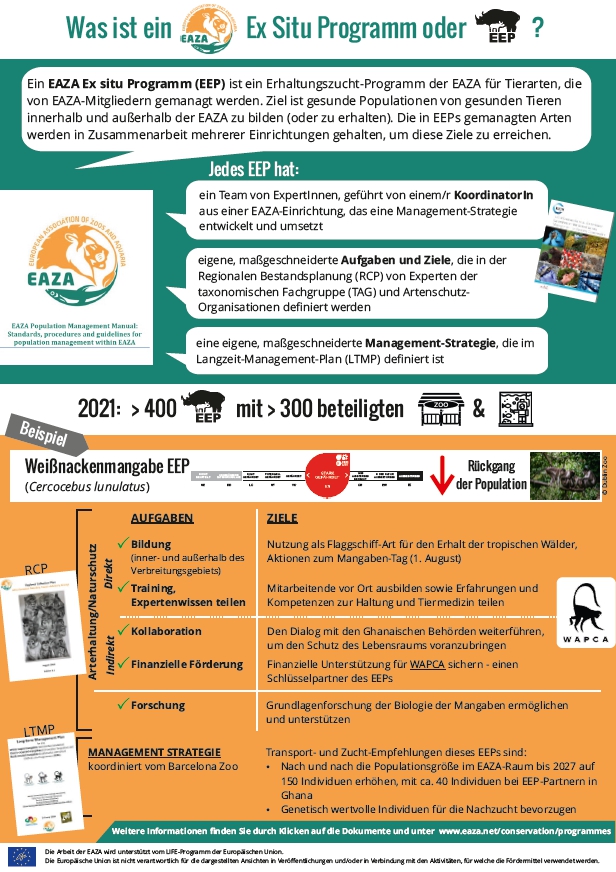 Viele Tierarten sind in der Wildnis so stark durch Lebensraumzerstörung oder illegalen Tierhandel bedroht, dass ihre Bestände besorgniserregend schnell abnehmen. Gezielte Vermehrung in menschlicher Obhut ist neben dem Schutz des Lebensraumes und der Eindämmung des illegalen Handels ein wichtiger Faktor, um die Ausrottung einer Tierart zu verhindern. Die Tiere, die in Zoos gehalten werden, stellen eine Reservepopulation für ihre im Herkunftsland lebenden Artgenossen dar. Um diese wertvolle Population innerhalb der zoologischen Gärten zu bewahren, wurden europaweite Erhaltungszuchtprogramme (EAZA Ex-Situ Programmes, kurz EEPs) aufgebaut. Diese sollen langfristig dafür sorgen, dass Tiere im Rahmen von Wiederansiedlungsmaßnahmen wieder in die freie Natur verbracht werden können, sobald deren Schutz sichergestellt werden kann. Kurzfristig dienen die EEPs dazu, den Bestand einer Tierart in menschlicher Obhut gesund und genetisch möglichst groß zu halten.