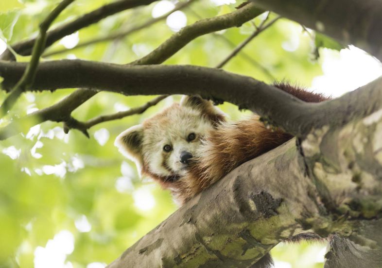 Ein Roter Panda blickt aus der Krone eines Baumes herab