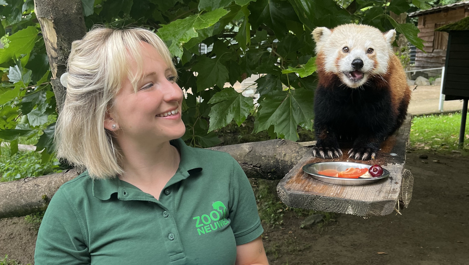 Die Zootierärztin des Zoo Neuwied posiert neben einem Roten Panda