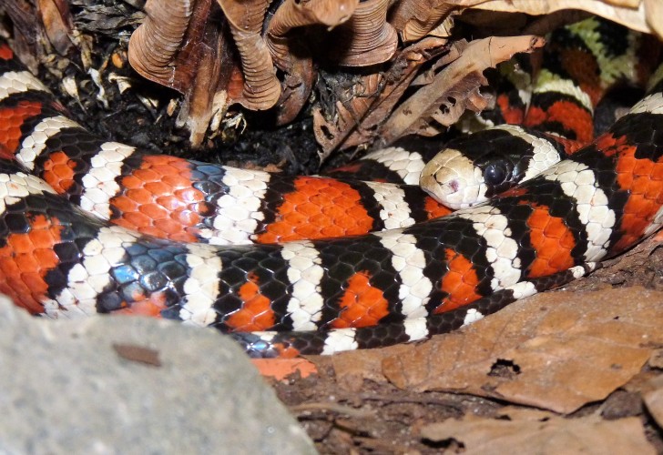 Eine entgegengesetzte Taktik wendet die amerikanische Bergkönigsnatter an: Die völlig harmlose, kleine Schlange ist so auffällig rot-weiß geringelt, dass sie für Fressfeinde wie Greifvögel leicht zu entdecken ist. „Aber ihre Färbung ist dem Muster der hochgiftigen, im gleichen Gebiet vorkommenden Korallenotter so ähnlich, dass die meisten Raubtiere lieber die Finger von ihr lassen. Den feinen Unterschied, nämlich einen dünnen, schwarzen Streifen zwischen roten und weißen Bändern, übersehen die Räuber offenbar“, vermutet Birkendorf. Das Imitieren von Tieren wird in der Fachsprache Mimikry genannt, im Falle der Bergkönigsnatter spricht man von Schutzmimikry: Sie trägt, wie die giftige Korallenotter, eine Warntracht, die signalisiert: Vorsicht, ich bin ungenießbar! „Eine Warntracht tragen auch viele Amphibien, wie unsere einheimischen Feuersalamander, die zur Zeit leider aufgrund ihrer Winterruhe nicht zu sehen sind. Sehen kann man ein Beispiel für eine Warntracht aber bei unseren Dreistreifen-Baumsteigern, auch wenn diese im Vergleich zu anderen Vertretern aus der Familie der Baumsteigerfrösche geradezu unscheinbar gefärbt sind.“