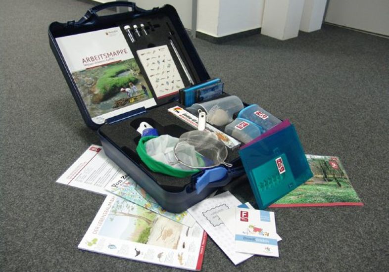 Er ist gefüllt mit vielfältigen Lehr- und Erlebnismodulen für den schnellen und einfachen Aufbau von Experimentierstationen im Klassenraum. Außerdem integriert der Koffer zwei Module für den Freilandunterricht zu den Themen Gewässergüte und Gewässerstruktur. Die spielerischen und interaktiven Stationen werden für 10 unterschiedliche Aspekte rund um das Thema Wasser angeboten: Neben Experimenten zu den klassischen naturwissenschaftlichen Themen wie Auftrieb oder Artenvielfalt umfasst das Spektrum auch mythische, künstlerische und entspannende Module. Der Wasser-Erlebnis-Koffer kann von Lehrerinnen und Lehrern (nach Vorbestellung) für den Unterricht in der Schule ausgeliehen werden.