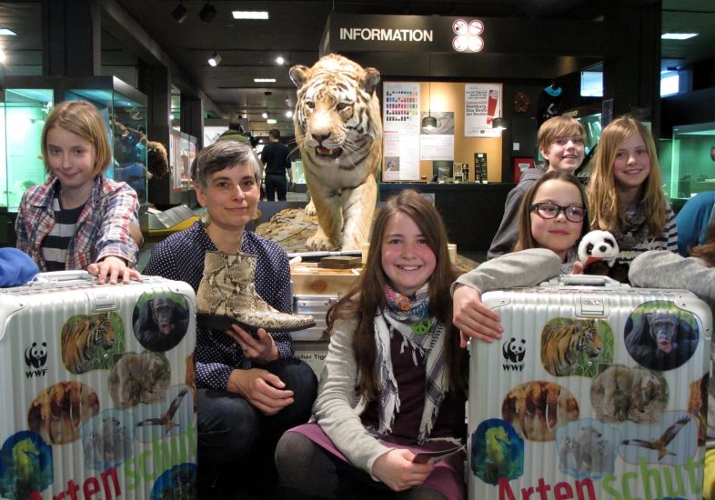 Mehrere Kinder und eine Frau posieren mit zwei Artenschutzkoffern des WWF. Die Frau hält einen Schuh aus Reptilienleder in der Hand, im Hintergrund steht ein ausgestopfter Tiger.